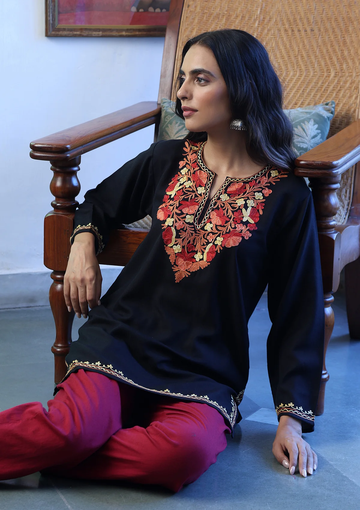 HOC Crafts Aari Embroidered Cotton Solid Women's Short Kurta - Black