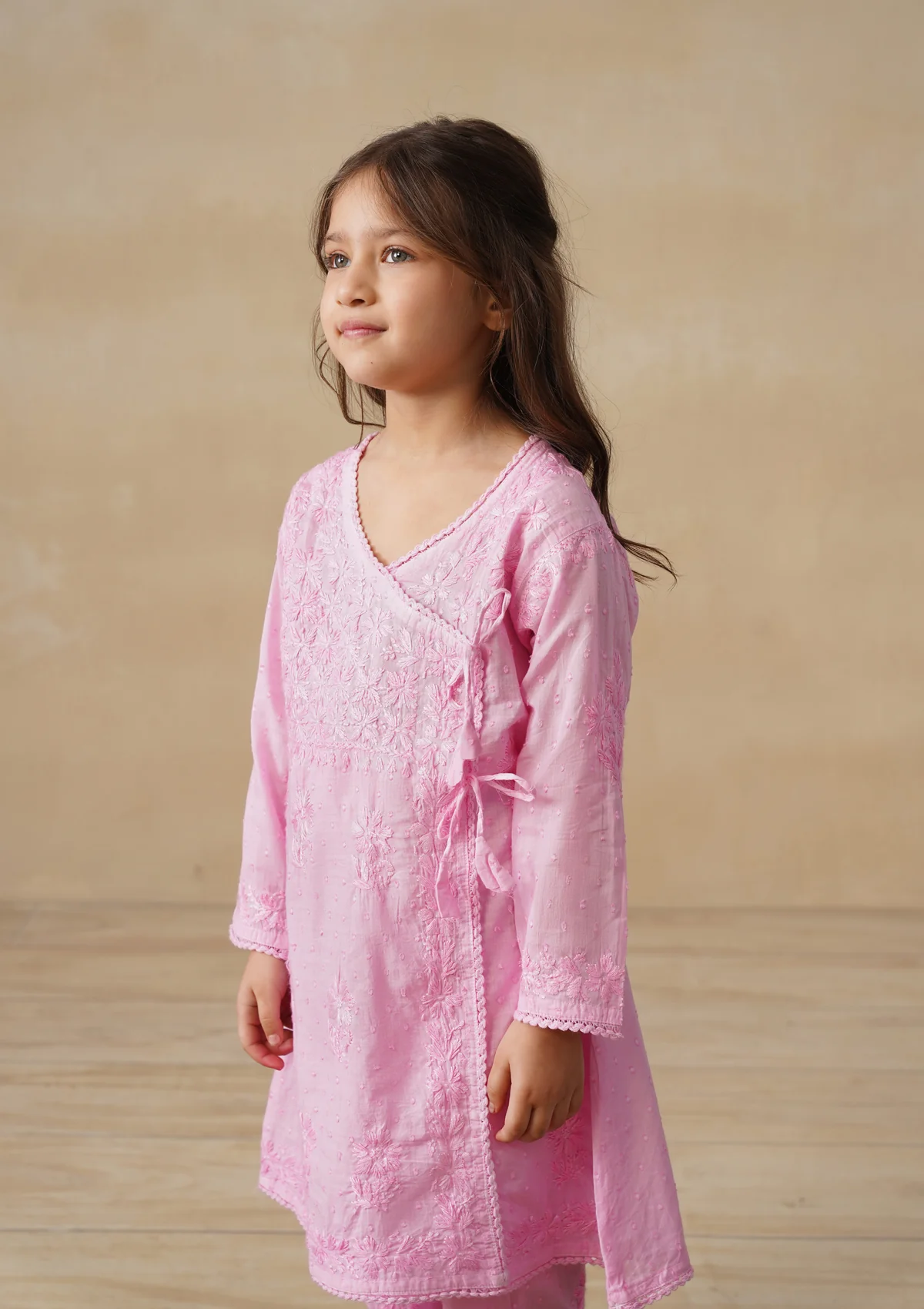 HOC Cotton Dobby Chikankari Solid Girls 2 PC Long Angrakha Kurta Set - Pink