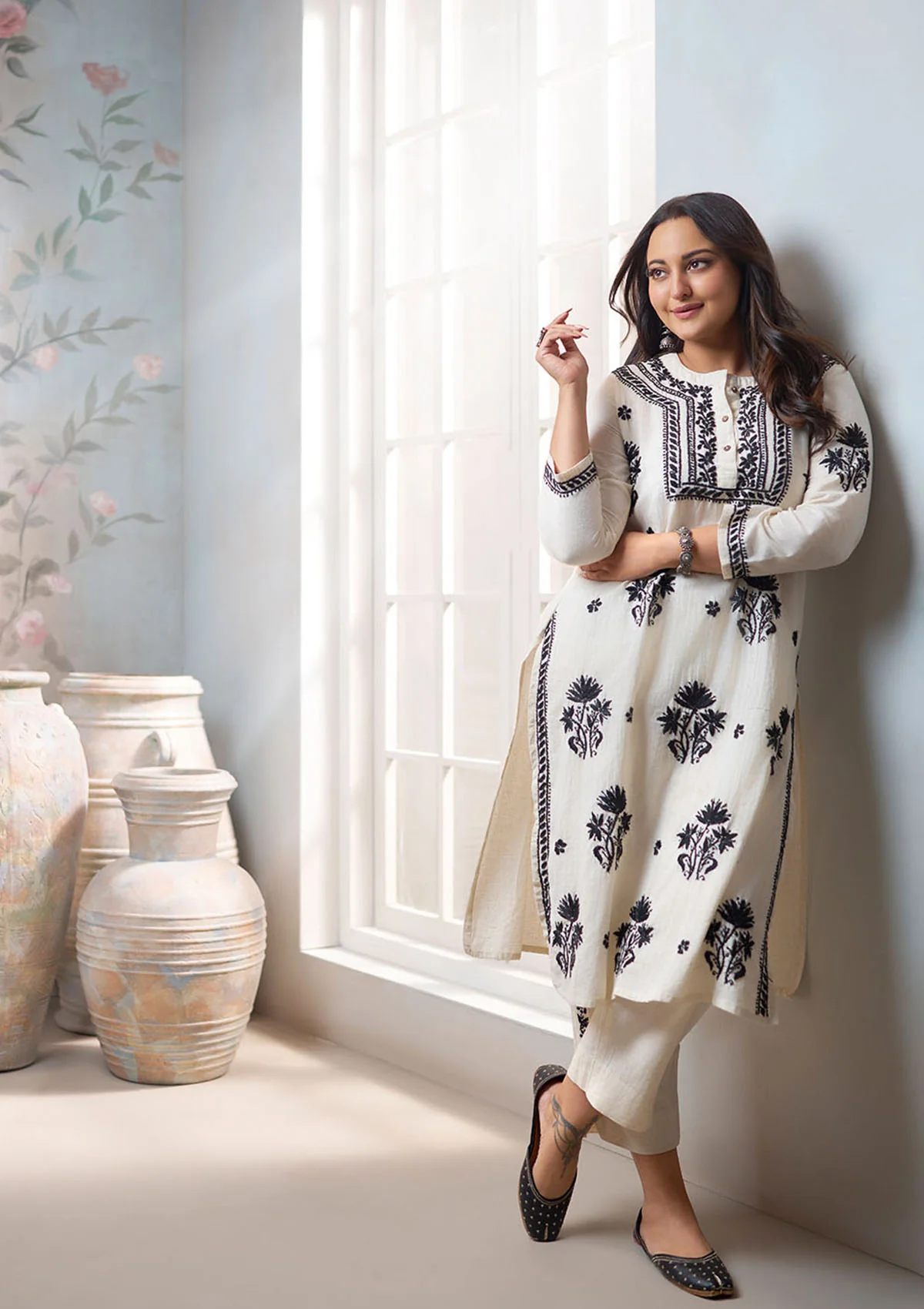 Sona Chikankari Solid Cotton Linen Women's 2PC Long Kurta Set - Off White