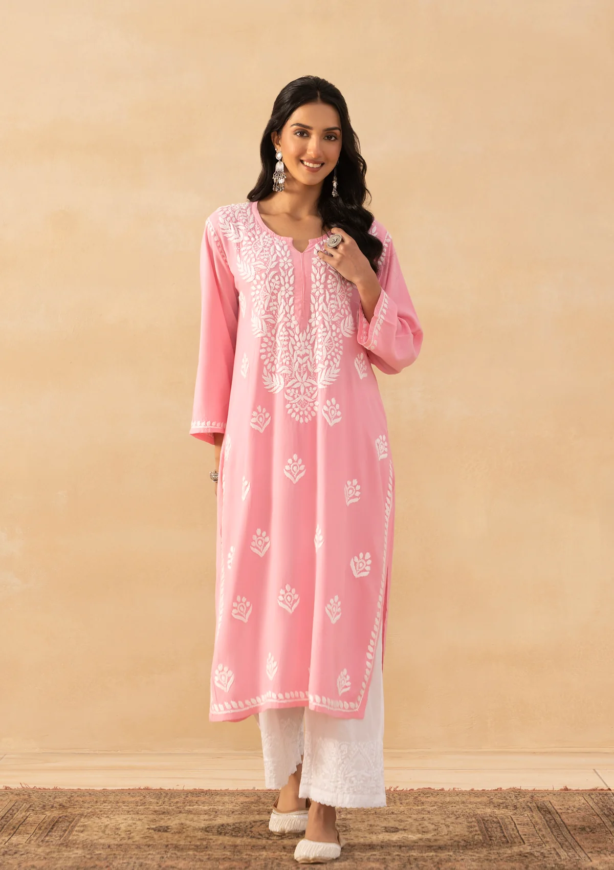 HOC Rayon Chikankari Solid Women's Long Kurta -Pink Pastel