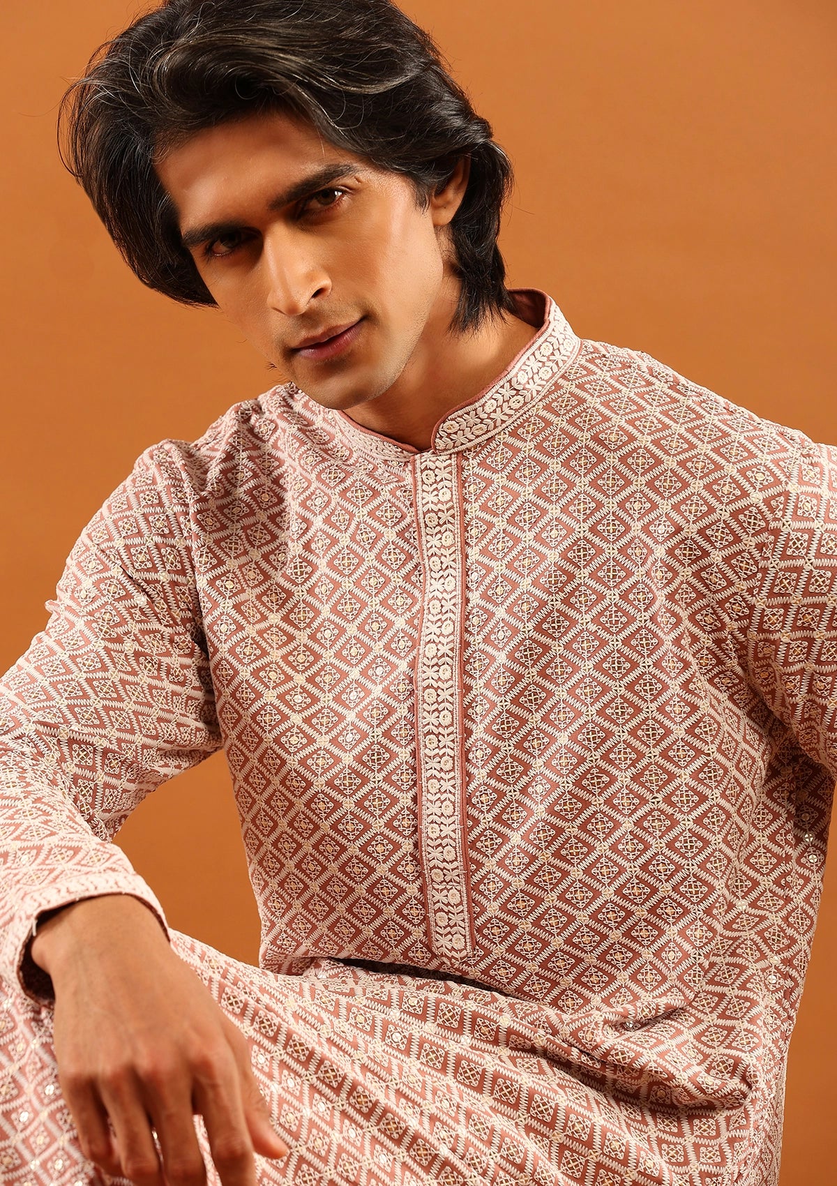 HOC Rayon Embroidered With Sequins Solid Men's Long Kurta- Dusty Pink