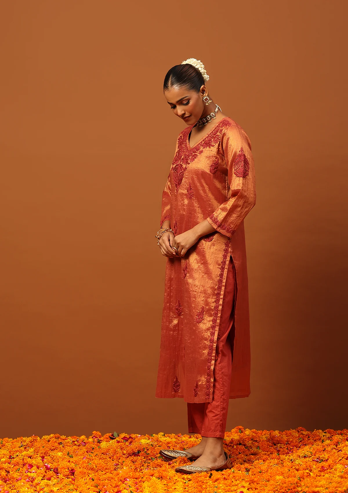 HOC Tissue Silk Chikankari Solid Women's Long Kurta With Inner-Copper